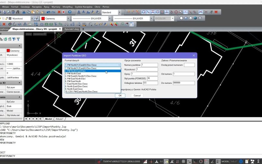 ImportPunkty.lspi kliknij Wczytaj (Load).Zamknij okno. Teraz możesz wpisać komendę